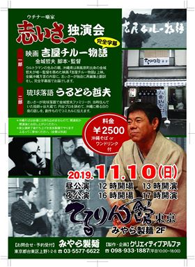 11月10日(日)てるりん館東京。志ぃさー独演会 昼・夜公演 ニュース X Facebook コピー 2019.11.082025.03.06 ウルトラマンを生んだ男、故・金城哲夫氏監督映画『吉屋チルー物語』と創作落語『うるとら哲夫』 みやら製麺の八重山そば付。 夜公演終了後は、打ち上げあり。(参加希望者)