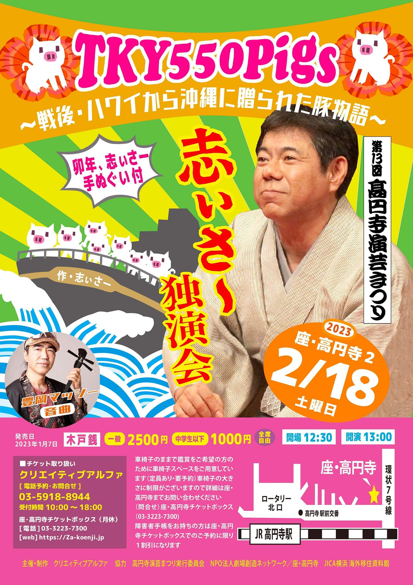志ぃさ~独演会 ニュース X Facebook コピー 2023.01.012025.03.06 毎年恒例の「沖縄かりゆし演芸まつり」は、訳ありで、不肖私の独演会となりました。どうぞ、拡散もよろしくお願いいたします。やややよ予約うけたまわります。2月18日(土)高座の上でマッチョ~イビンド~